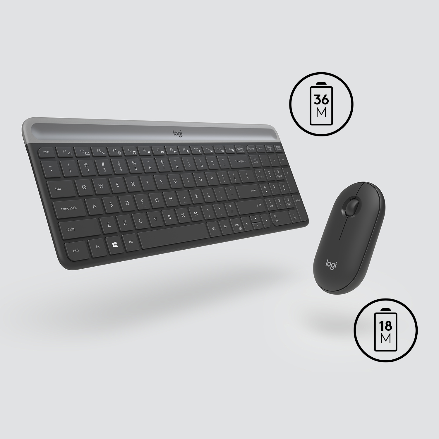 LOGITECH MK470 SLIM COMBO – GRAPHITE – US INTL – 2.4GHZ – N/A – INTNL-973. SLIM WIRELESS KEYBOARD AND MOUSE WITH MODERN MINIMALIST DESIGN. QUIET SCISSOR KEYS AND LOW-NOISE MOUSE IDEAL FOR SHARED SPACES. USB NANO RECEIVER AND LONG BATTERY LIFE UP TO 36 MONTHS.