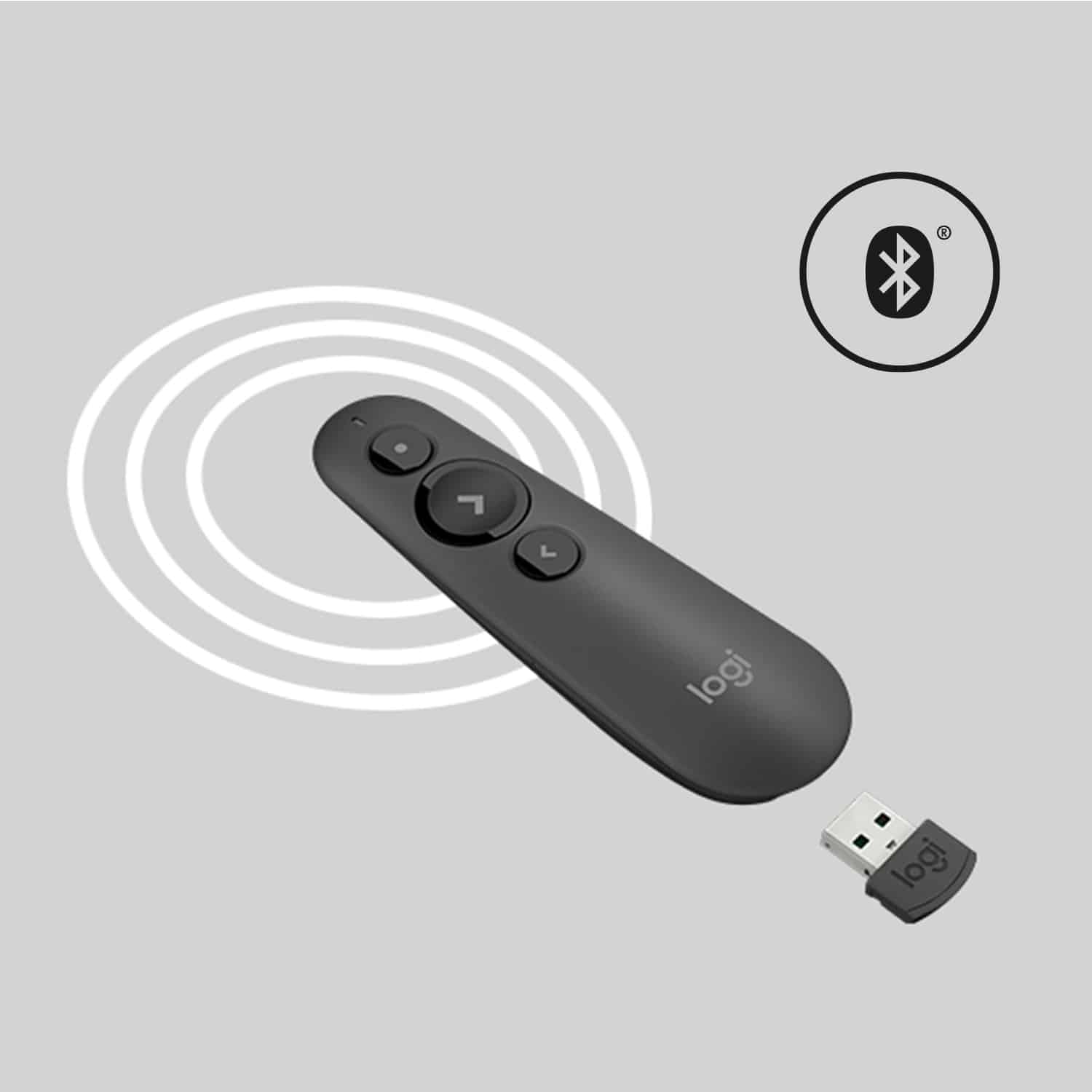 LOGITECH R500S RED LASER PRESENTATION REMOTE WITH WIRELESS MINI RECEIVER SIMPLE THREE-BUTTON DESIGN WITH RED LASER POINTER. BLUETOOTH OR USB RECEIVER CONNECTION. 20M RANGE AND APP CUSTOMIZATION VIA LOGI OPTIONS+